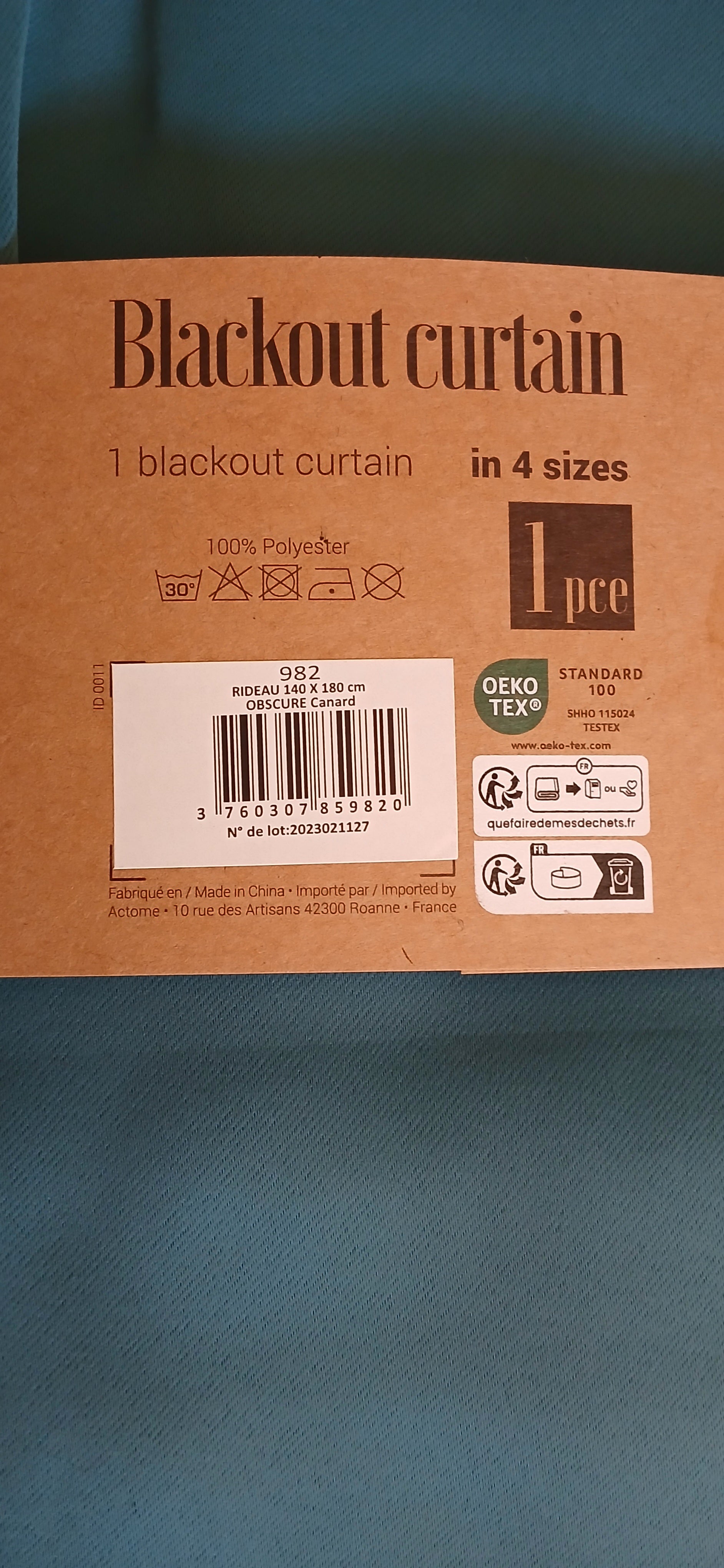 2 Rideaux occultants 140 x 180 cm en polyester 100% certifié Oeko-Tex, teinte Obscure Canard Pour optimiser l'obscurité et l'isolation thermique de vos espaces.
