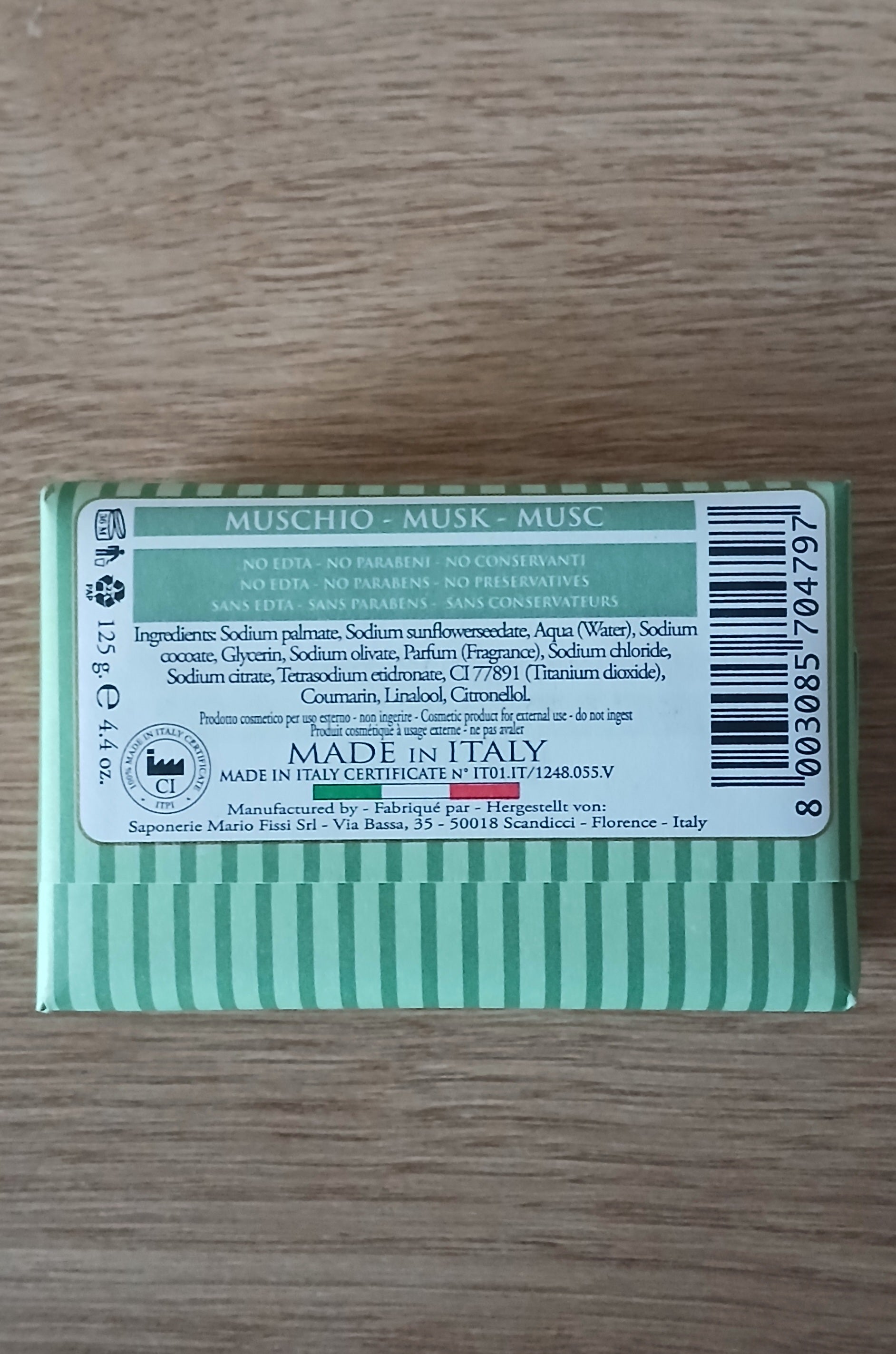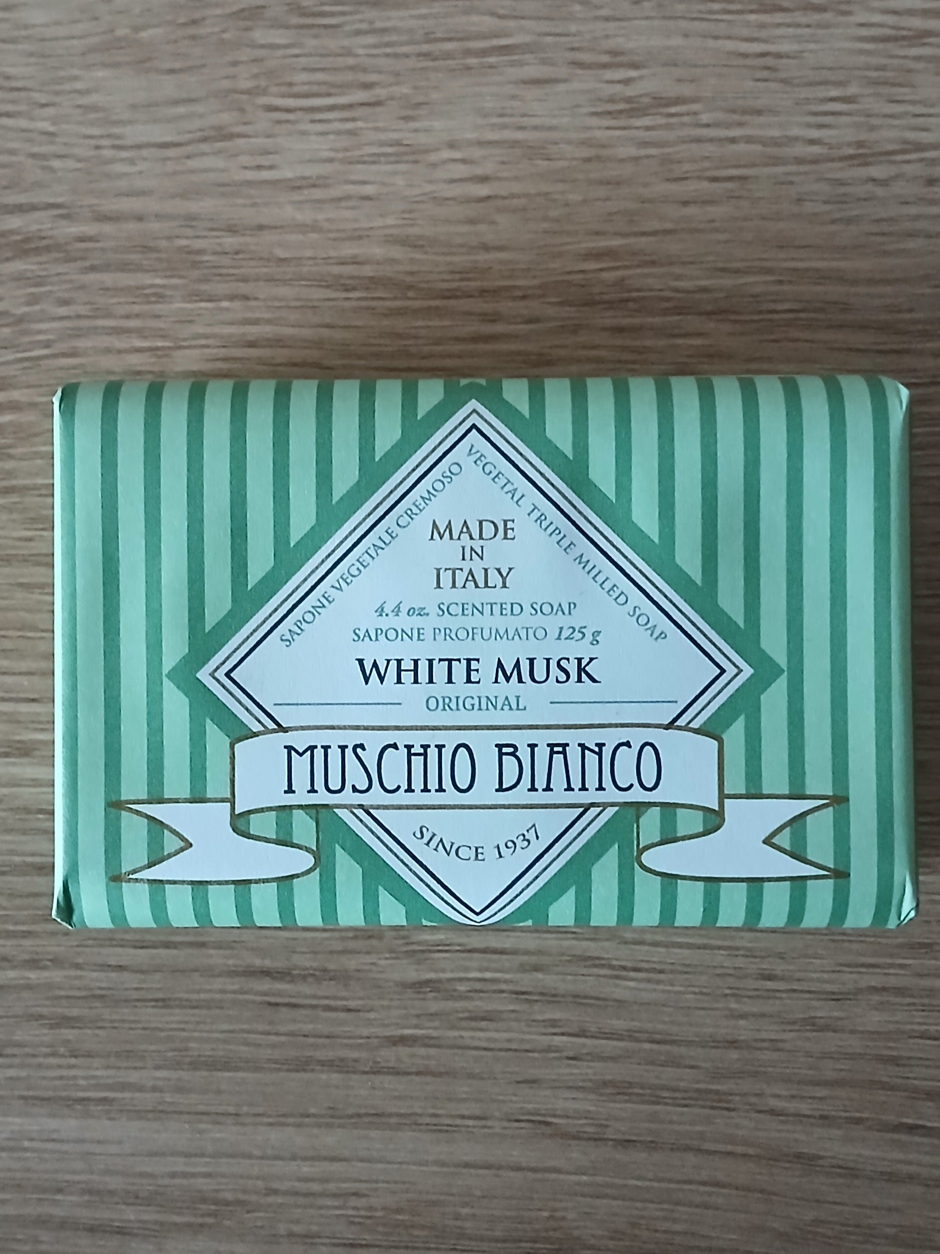Découvrez le savon italien Muschio Bianco de 125gr, un produit traditionnel fait avec soin en Italie. Profitez de ses bienfaits nourrissants et hydratants grâce à sa formule unique à base de muschio bianco. Offrez-vous une peau douce et saine avec ce savon de qualité supérieure.